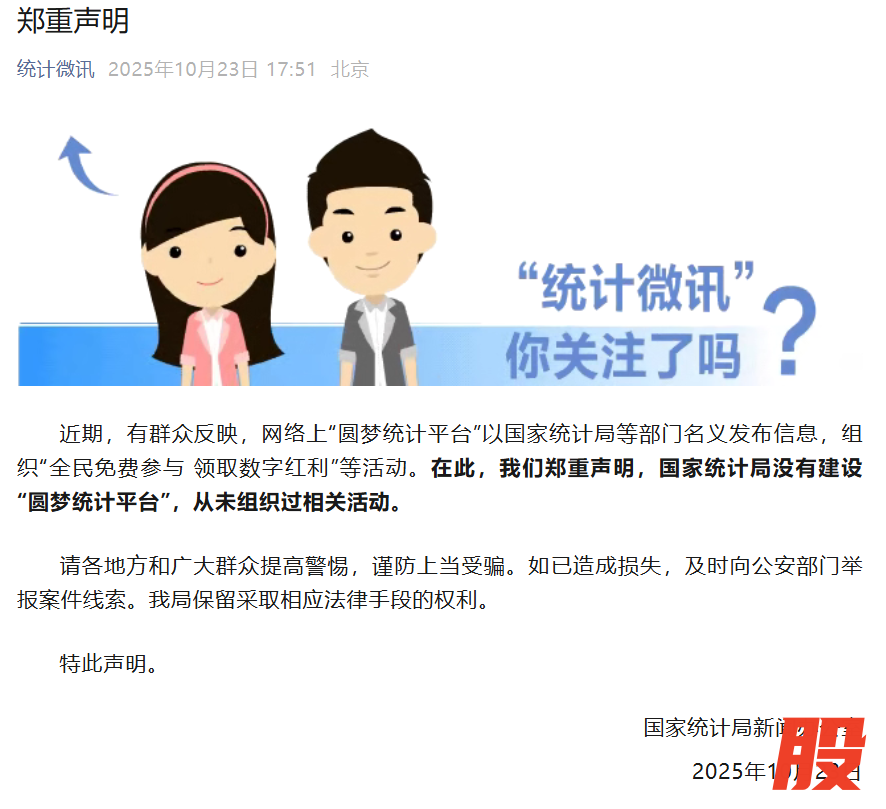 国家统计局郑重声明:从未组织过“圆梦统计平台”相关活动国家统计局郑重声明:从未组织过“圆梦统计平台”相关活动
